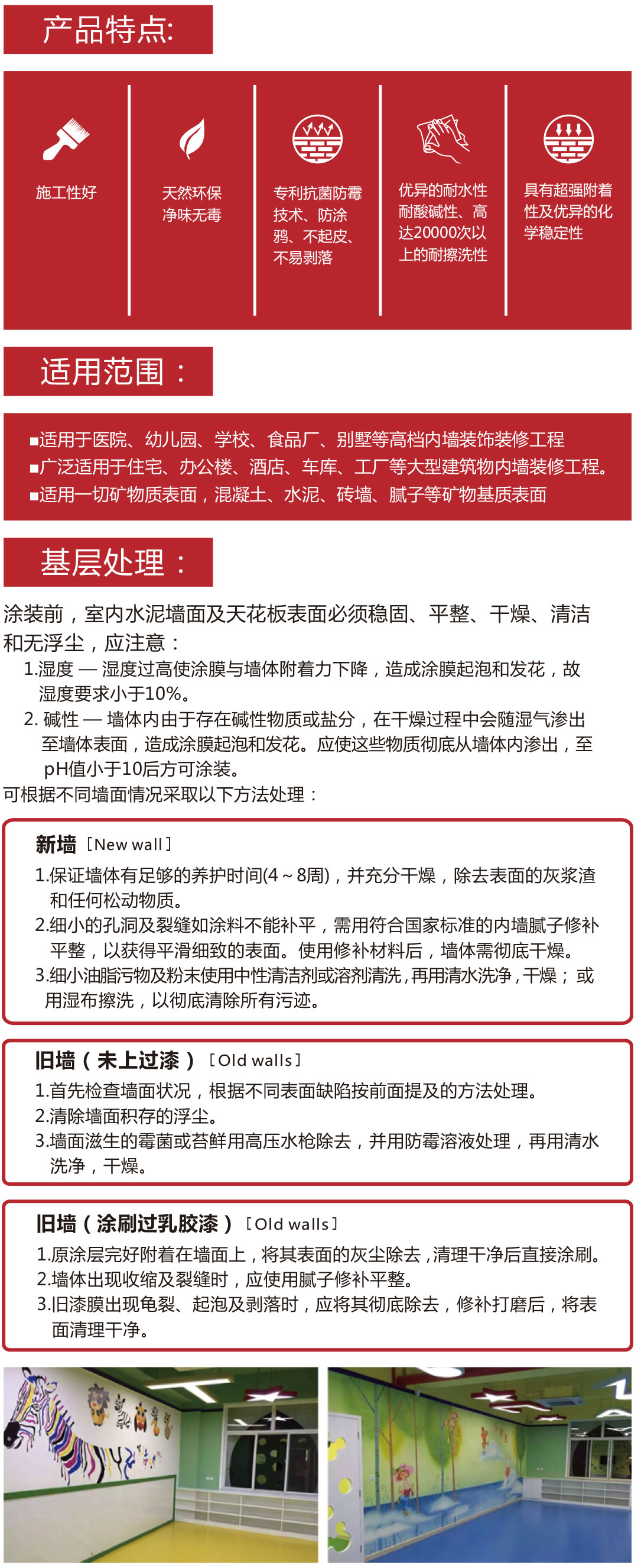 抗菌防涂鴉水漆是采用集團最新工藝與技術(shù),融合環(huán)保理念開(kāi)發(fā)的一款環(huán)保水漆產(chǎn)品,具有抗菌,耐污防塵、防涂鴉特性。特別是兒童房、酒店、食品、釀酒、醫院、廚房及生物制品等行業(yè)的潔凈廠(chǎng)房、生產(chǎn)車(chē)間、倉庫和地下建筑等公共場(chǎng)所易受各種污漬、霉菌污染的內外墻涂裝。